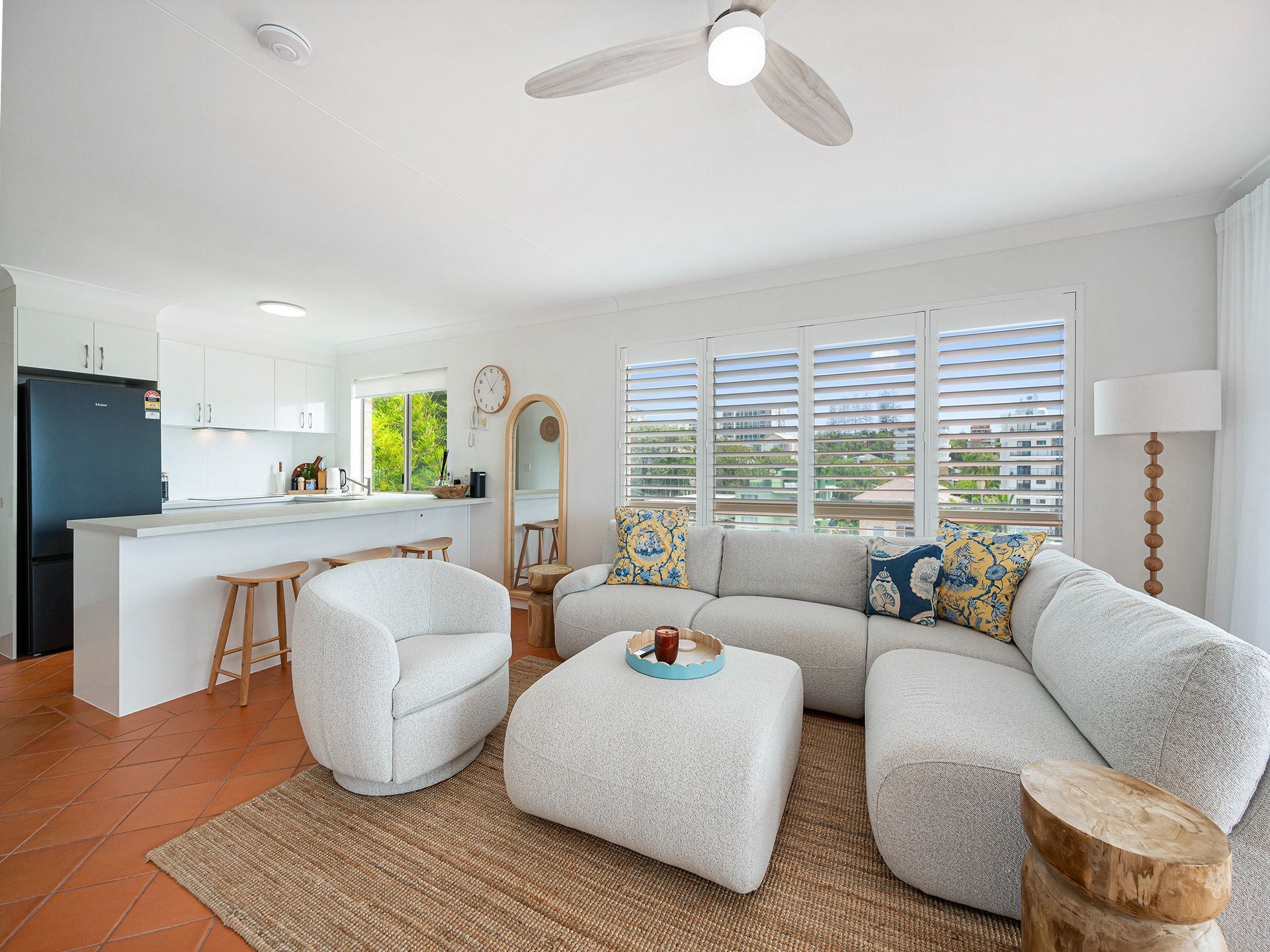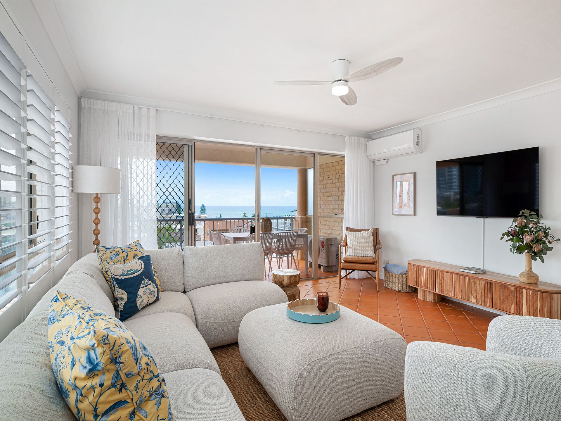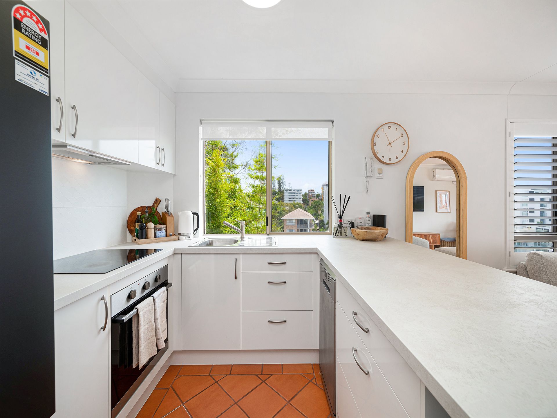 Step inside and you’re welcomed into a bright and breezy open plan living, dining, and kitchen area that flows directly onto a spacious front balcony – the perfect setting to entertain, relax, or take in the panoramic views over the ocean and coastline. Perfectly positioned to make the most of the stunning outlook, the central kitchen is well-appointed.